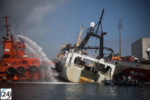 Instalan barreras anticontaminación en Ribeira tras control del incendio del buque Awadi.