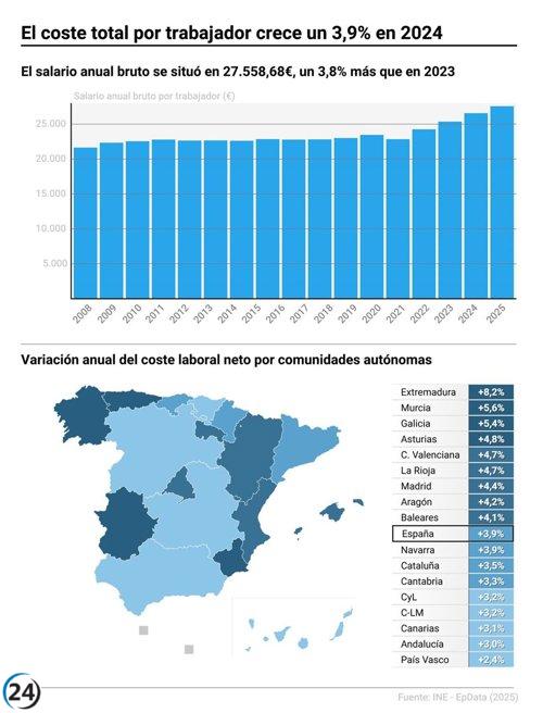 Galicia experimenta en 2024 un incremento del 5,4% en el coste laboral, el más alto desde 2008, aunque aún inferior en 3.667 euros a la media nacional.