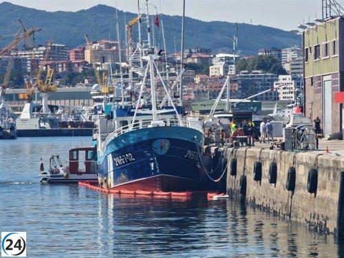 Un barco de pesca encallado en el puerto de Vigo requiere ser remolcado para evitar un posible accidente.
